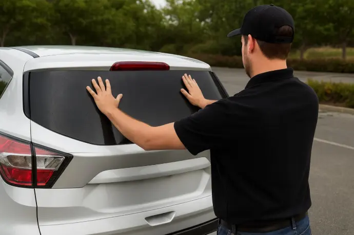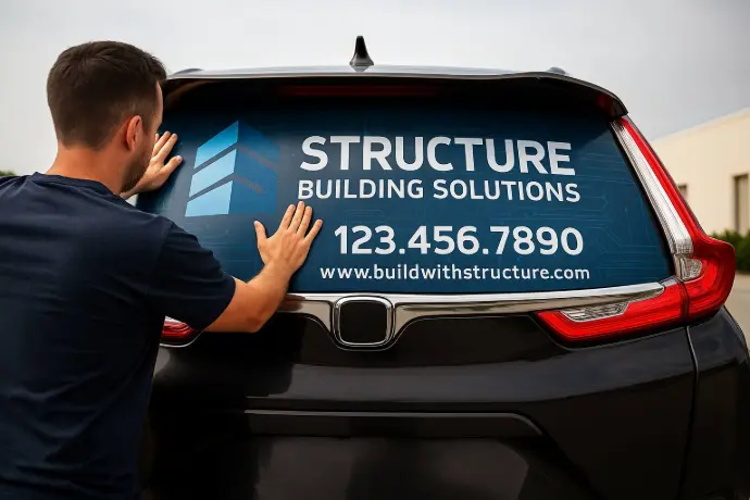Logos, business info, or messaging applied to vehicle doors and windows.